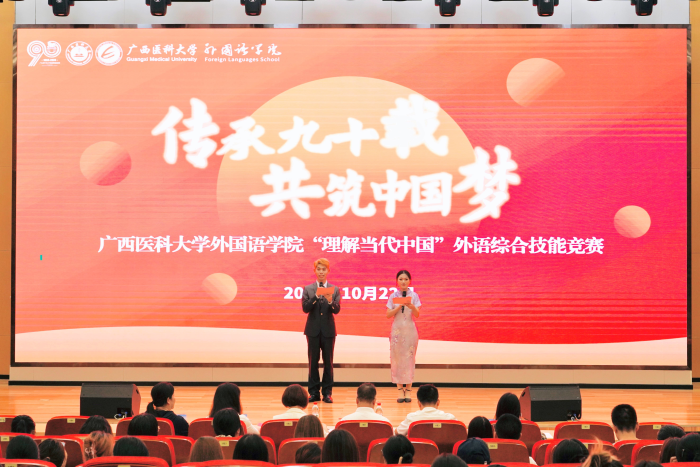 为庆祝公司90年华诞,太阳成tyc7111cc于10月22日在武鸣校区图书馆报告厅隆重举行了“传承九十载 共筑中国梦”—“理解当代中国”外语综合技能竞赛。公司韦建辉书记、周秀琼经理、黄万获副书记、吕晓敏副经理、公共外语部张樱子主任和翻译专业教研室李丹主任担任本次比赛评委。公司全体教师、翻译硕士研究生以及英语、翻译专业本科生共100多人参加了本次活动。