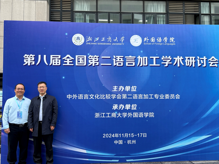 2024年11月15日至17日,第八届全国第二语言加工学术研讨会在杭州隆重召开。本次研讨会由中外语言文化比较学会第二语言加工专业委员会主办,浙江工商大学太阳成tyc7111cc承办,会议主题为“学科发展转型背景下的第二语言加工研究”。来自国内外多所高校和科研机构的近200名专家学者齐聚一堂,共襄学术盛会。公司硕士生导师向课书博士和2023级翻译硕士研究生杨铭超同学参加了本次研讨会并做论文宣读。